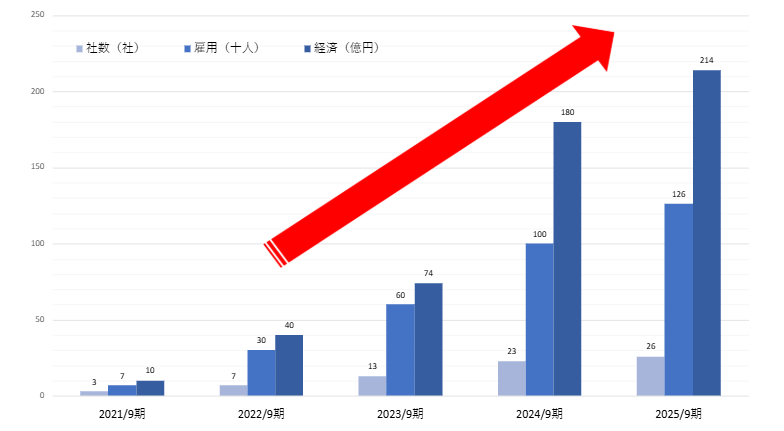 2018年11月の設立から約7年で、26社、214億円超、1260名超のグループに成長